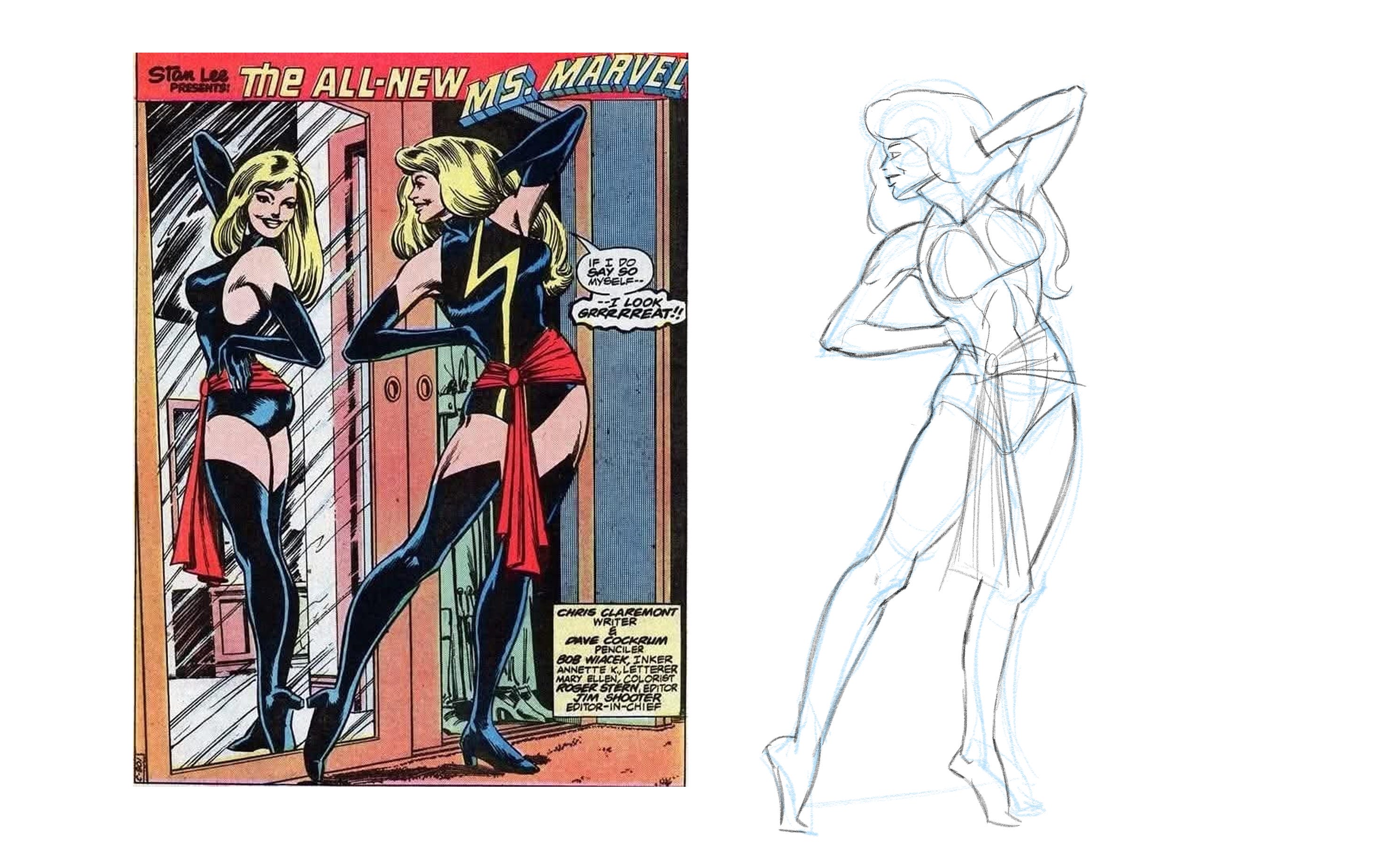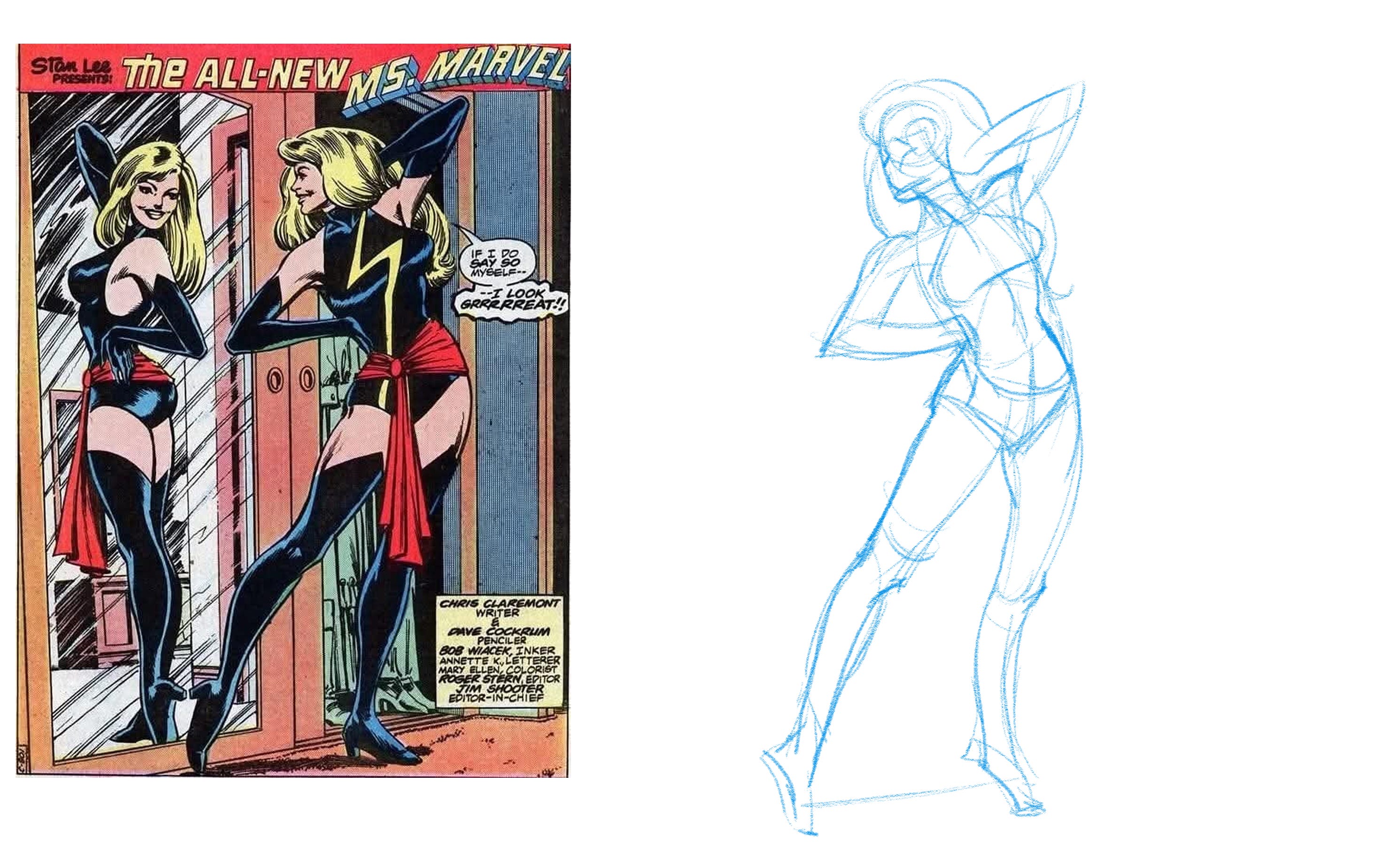 For this post, I am trying something different: "fixing" a panel from a vintage comic book. Specifically, I will be working on the opening page of Ms. Marvel (Carol Danvers) #20, published in 1978 and illustrated by the great Dave Cockrum.